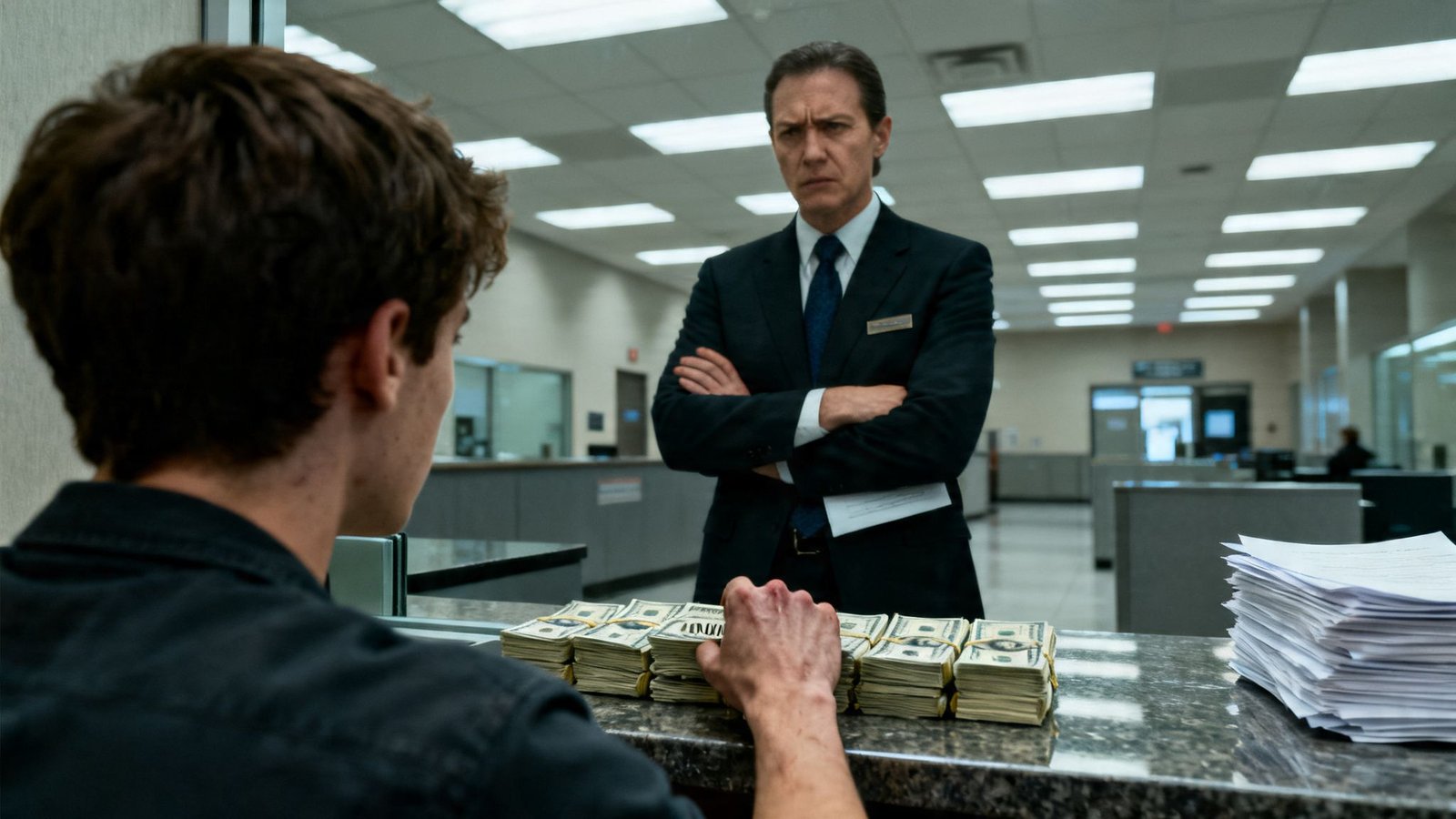 Agarró una pila de papeles de su escritorio y los golpeó contra la superficie con un ruido seco. «Mira, chico», dijo, su voz ahora más dura, más condescendiente. «No tenemos tiempo para bromas aquí. Este es un banco serio».
