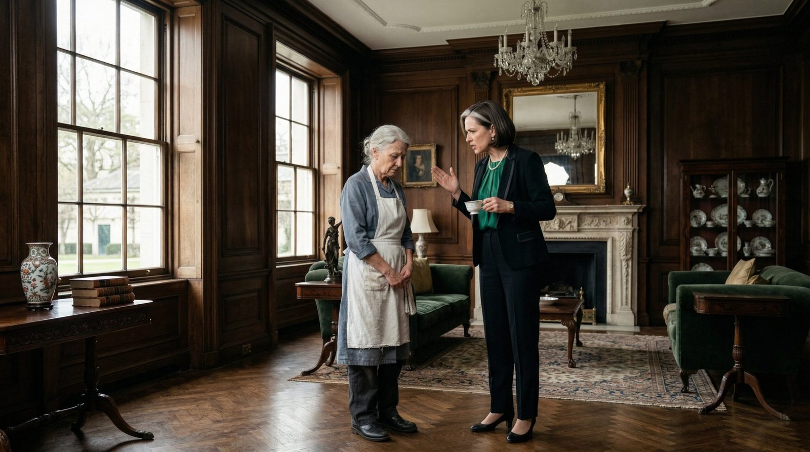 La anciana ya no llevaba el delantal puesto. Estaba sentada en el lujoso sofá de cuero blanco, hundida en su comodidad. En sus manos, ya libres de la bandeja de plata y los platos pesados, sostenía una taza de cerámica barata, de esas que a ella le gustaban, humeante con un café recién colado.