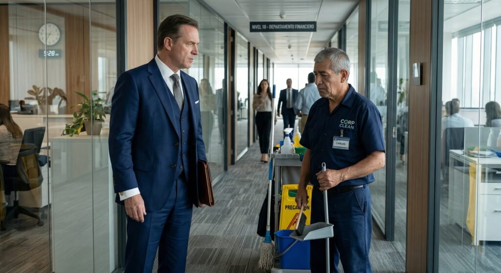 —»Usted pensó que yo solo veía el suelo que limpiaba»,— dijo Jorge con voz suave pero que resonó en toda la sala. —»Pero mientras yo miraba sus zapatos, yo aprendía sus debilidades. Usted nunca vio a la persona, solo vio el uniforme».