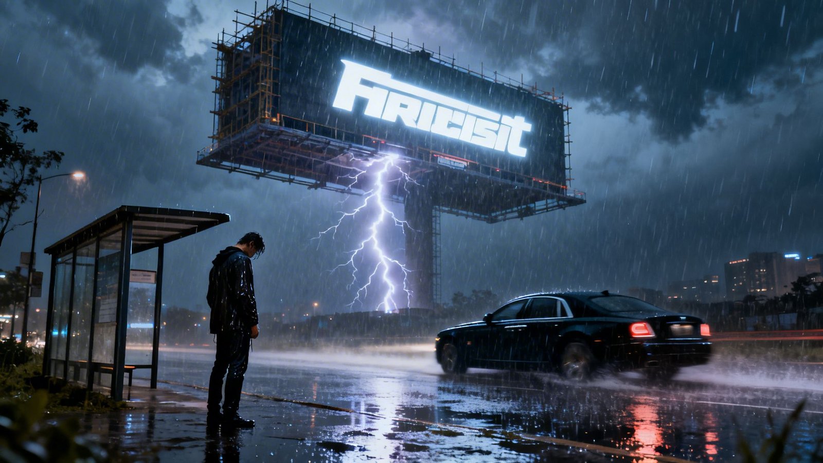 No muy lejos, justo frente a él, un cartel gigante recién instalado brillaba bajo la luz intermitente. Era un anuncio enorme, de esos que prometen un futuro brillante.