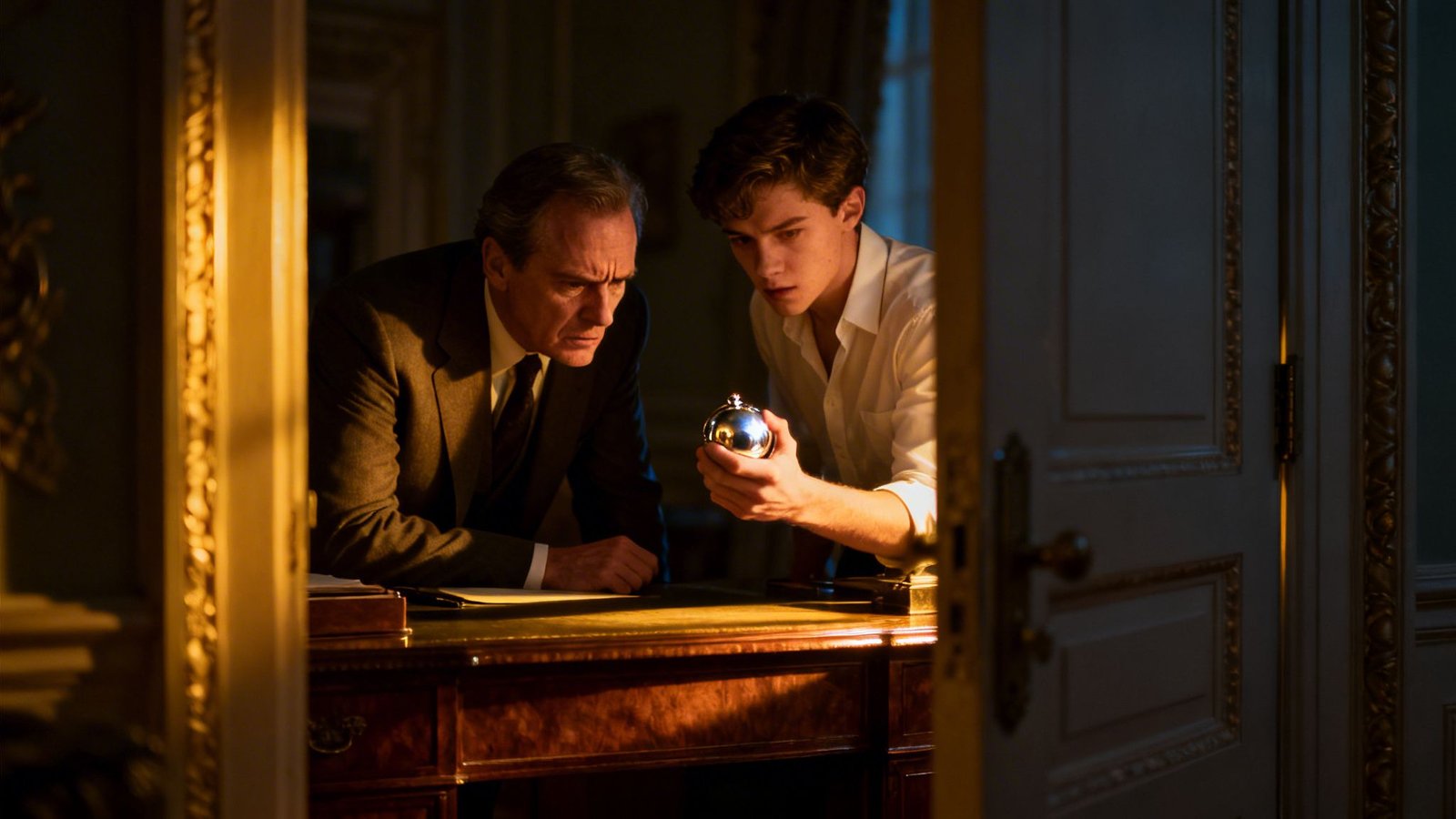 Al pasar por el pasillo del estudio, vio la luz encendida. La puerta, de caoba maciza, estaba entreabierta, dejando escapar un delgado haz de luz amarilla.